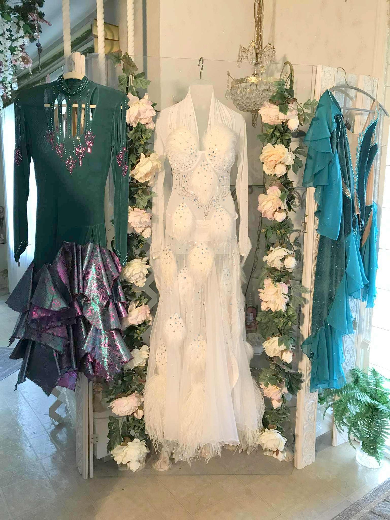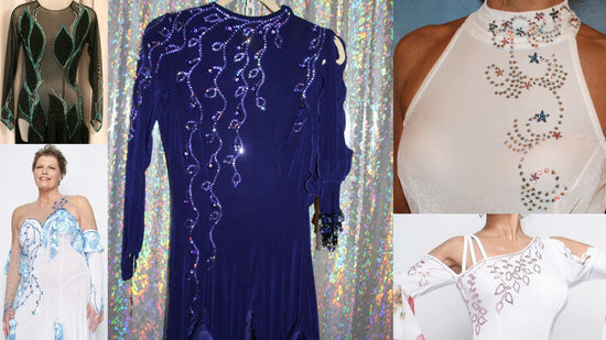 For those with a ballroom outfit or those eyeing a favored ballroom, Latin-Rhythm, or tango dress from our collections that you deeply admire for their color and style, but crave more shimmer, we're here to fulfill your desires! Rhinestone work, hand beading, as well as feathers, flounces or fringe can be added to most of Crystal's Creations Base Ballroom Dance Dresses or Social Ballroom Dresses to turn them into a Ballroom Show Dress of your dreams! See Some Examples! More Examples!