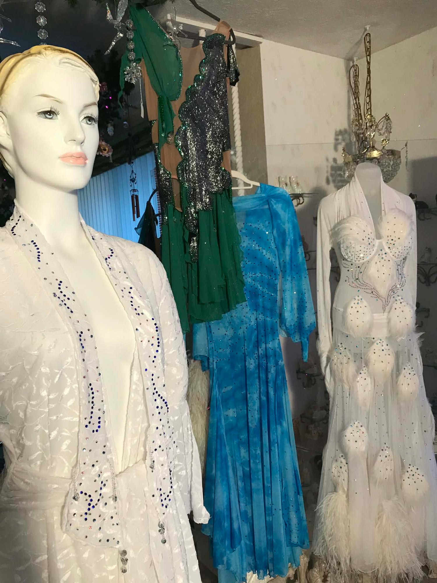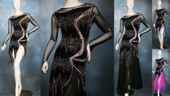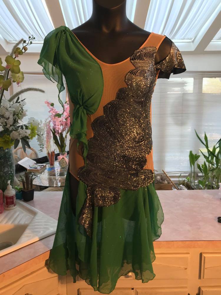 For those with a ballroom outfit or those eyeing a favored ballroom, Latin-Rhythm, or tango dress from our collections that you deeply admire for their color and style, but crave more shimmer, we're here to fulfill your desires! Rhinestone work, hand beading, as well as feathers, flounces or fringe can be added to most of Crystal's Creations Base Ballroom Dance Dresses or Social Ballroom Dresses to turn them into a Ballroom Show Dress of your dreams! See Some Examples! More Examples!