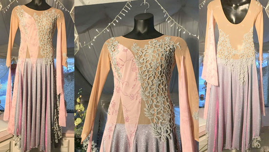 The beginning stages of a pink-lace-sparkle ballroom dress created on a nude color sheer stretch base with shimmering grey lace hand cut appliques & skirt insets, pink hand crafted overlays & floats with a delicate glitter floral pattern, finished with skirting of a gorgeous glittering fabric that shine pink & slate blue. Once the sewing is complete, then the rhinestone work will commence! It will fit a size 9/10-13/14