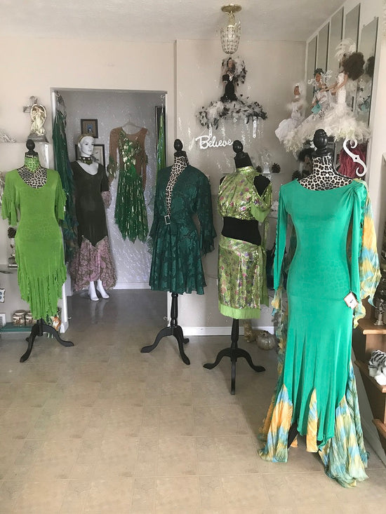 Experience the beauty of our ballroom dresses, Latin-rhythm dresses, and social dance dresses in captivating shades of green that are sure to turn heads.