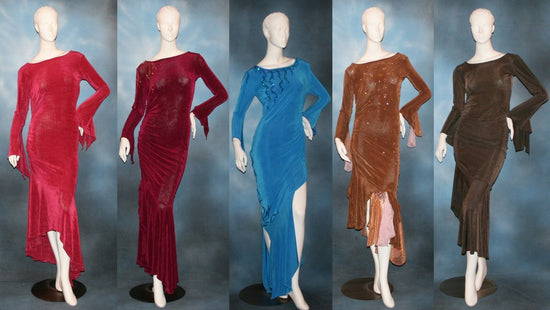 A slinky, sleek, elegant Latin/rhythm or tango dress, with classic simplicity, that can always be embellished with Swarovski rhinestone work, from a simple touch to as elaborately ornate as you desire! Some do have Swarovski rhinestone work. Kept simple, makes a great social dance dress for any occasion! And some may be gone, however, more can be custom created especially for YOU!