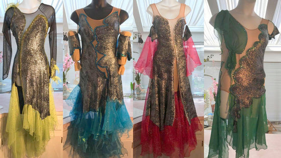 Latin/Rhythm dresses, plus a converta ballroom dress created of a gorgeous silver swirls glitter slinky as the main base teamed with colorful accents of hot pink, deep sea blue, emerald green & other gorgeous accent colors! Check these gorgeous ones out!