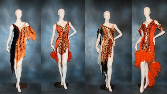 An exclusive array of tiger print Latin-rhythm dresses, crafted mainly in orange tiger print lycra, lavishly adorned with Swarovski rhinestones, hand-beading, and some with feathers! Each of these exotic dresses is named after tigers with special meanings! Be a tigress on the dance floor!