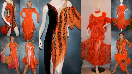 Looking for orange ballroom dresses, Latin-rhythm dresses, tango dresses, or social dance dresses? Embrace simple, classic, or go bold with a hint of animal print. find them here!