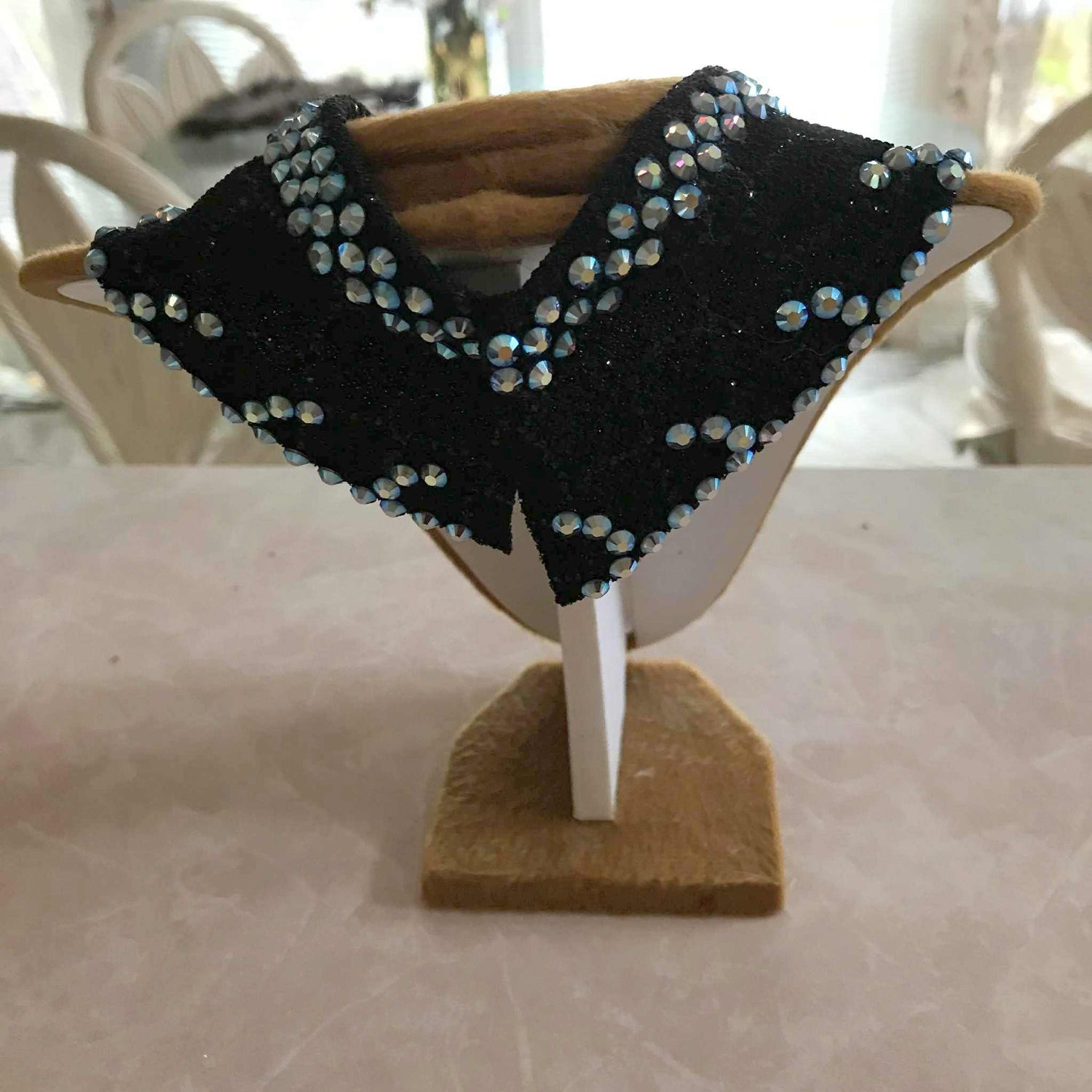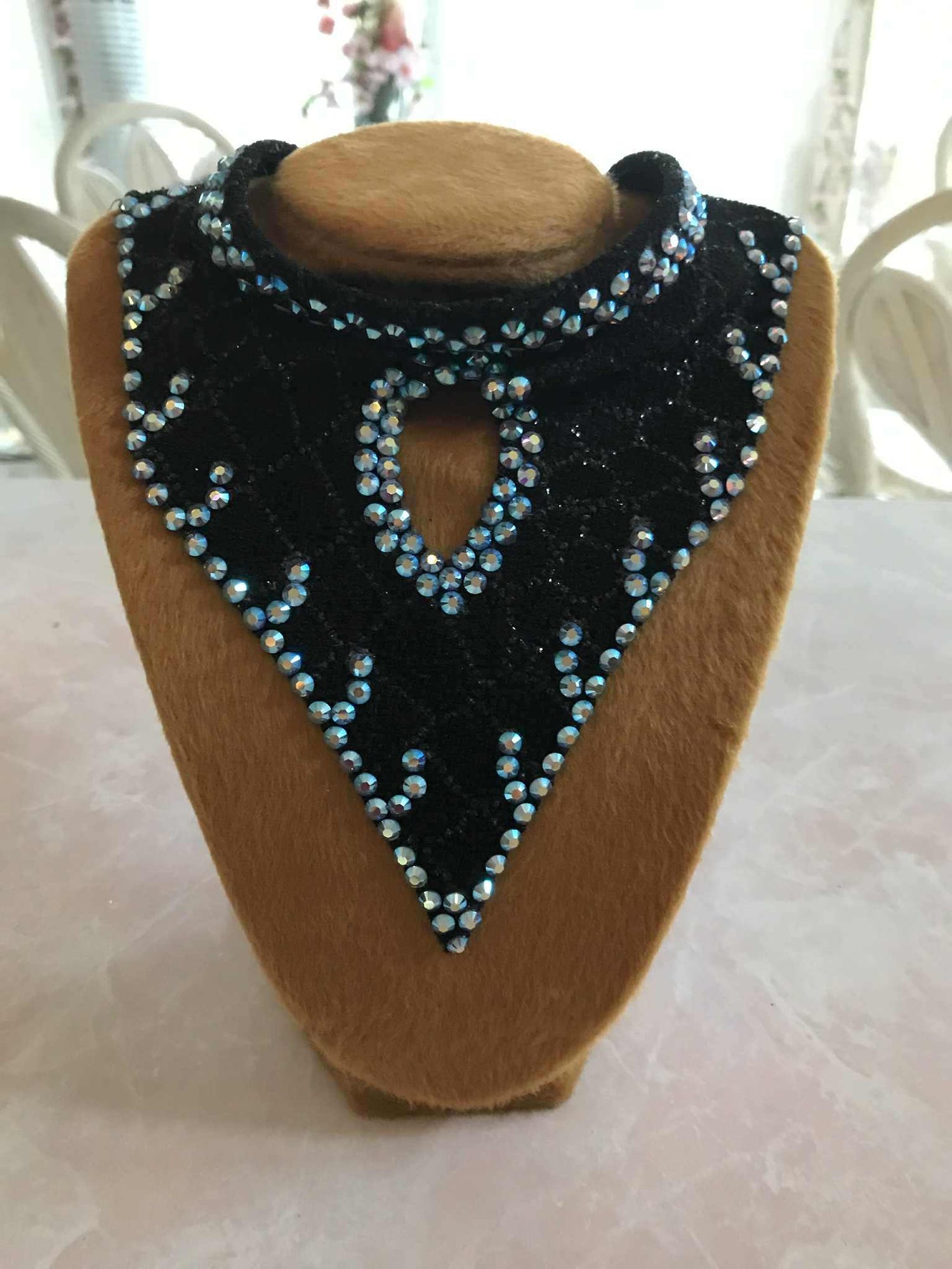 Elevate your ballroom wardrobe with this stunning neckpiece, crafted from luxurious glitter slinky fabric and adorned with jet black AB Swarovski rhinestones that catch the light in mesmerizing aqua hues. The dramatic deep V silhouette is designed to command attention on the dance floor, whether you're perfecting your Latin technique or mastering a classic tango. Wear it solo to transform any existing ensemble, or let us design a custom dress that showcases this piece as the centerpiece it deserves to be. Pure ballroom elegance.