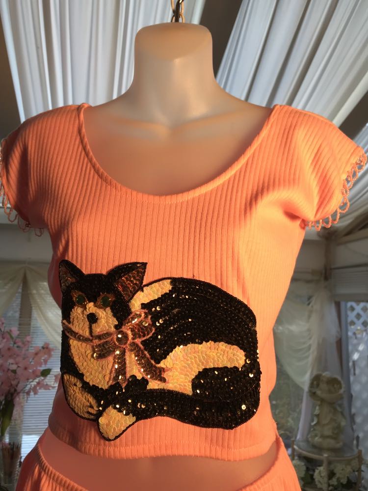 For the dancer-cat lover, show off your moves in this purrfectly pink set! Crafted from cotton rib knit, the crop top features cap style sleeves edged with delicate pink hand beading and a big black & white sequined cat applique! Unleash your inner feline, whether it's at dance practice, a studio party, or a cruise!