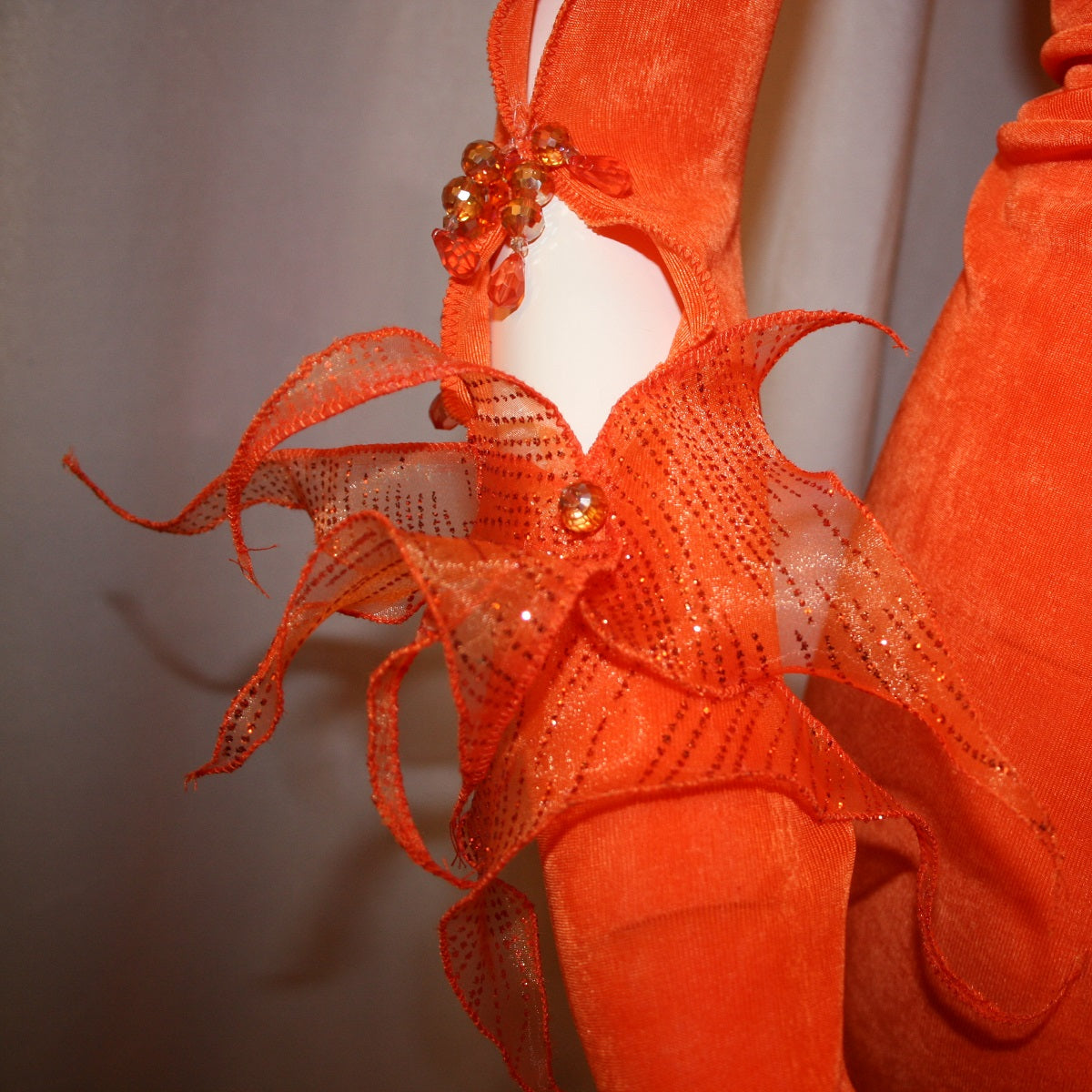 Glam up your Latin-rhythm moves with the dazzling Eliza Dress! Flaunt its oodles of glitter organza flounces and accents, along with the braided shoulder straps and Swarovski-bead embellished right sleeve with peek-a-boo effect! Oh-so-sensational in luxurious stretch slinky orange fabric, it's perfect for the dance floor, whether you're a pro or a beginner ballroom dancer! Get ready to turn heads with Eliza - if you love orange and something simple, elegant, slinky, and summery, she's your go-to Latin-rhythm dress!