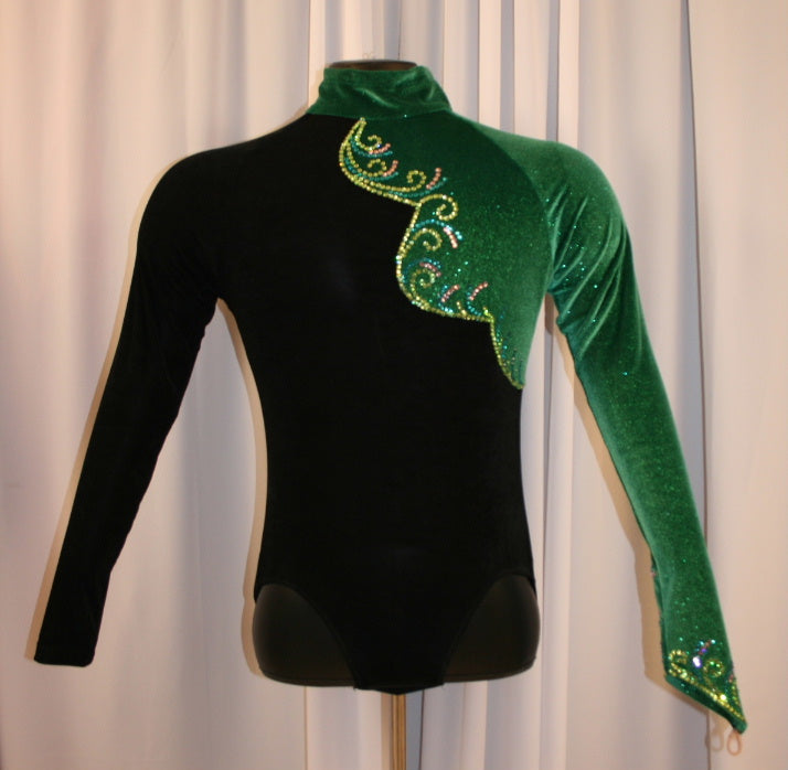 Men's black slinky Latin-rhythm dance shirt, featuring long sleeves and a crew neck, is taken to the next level with a scalloped color block in sparkling emerald green stretch velvet, accented with exquisite Swarovski rhinestone details in peridot green and orchid. The perfect touch of Emerald Green to make this dance shirt stand out on the competition dance floor!