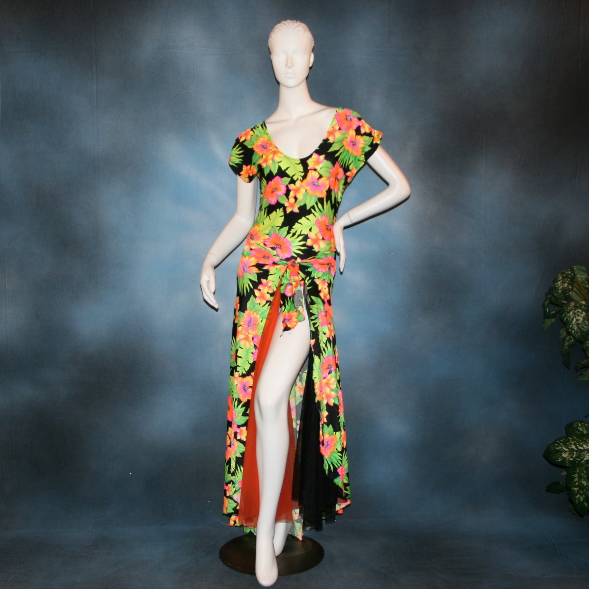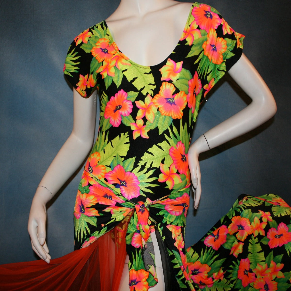 This tropical print bodysuit and ballroom skirt set is perfect for any ballroom dance - from the Hawaii Star Ball to a practice session. The bodysuit features a scoop neck and cap sleeves, while the wrap-style skirt is crafted from tropical print lycra with a black background and orange, yellow, and green accents. Flowy tricot chiffon in orange and black adds extra movement to the side panels.